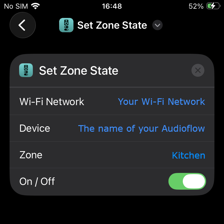 You now have a Shortcut that you can use in iOS for an Audioflow action. When you click on this Shortcut it will turn on the kitchen speakers in this case. You can create as many of these as you like for the actions you would like to perform.