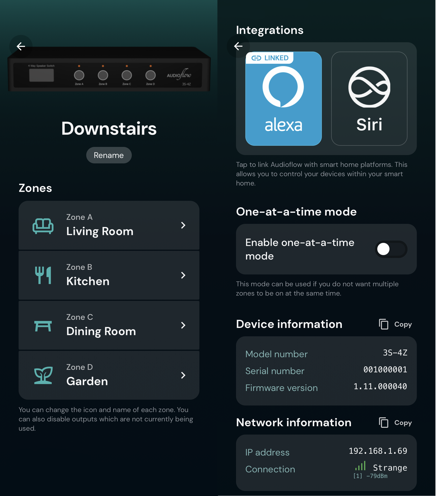 Rename - You can give your Audioflow a name here. We would recommend you match the name of the connected amplifier.